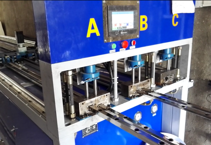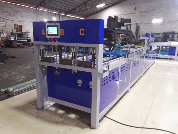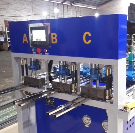 三工位數控全自動沖孔機,三工位同時工作,一次沖6支管,每個油缸可單獨控制沖全孔、半孔,大大提高不銹鋼防盜網沖孔效率,行業(yè)首創(chuàng),專利產品