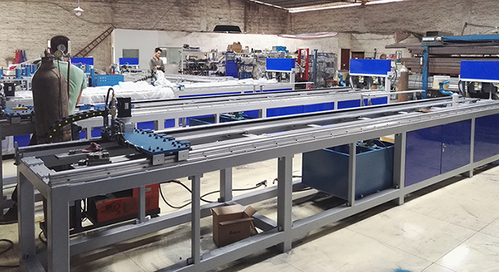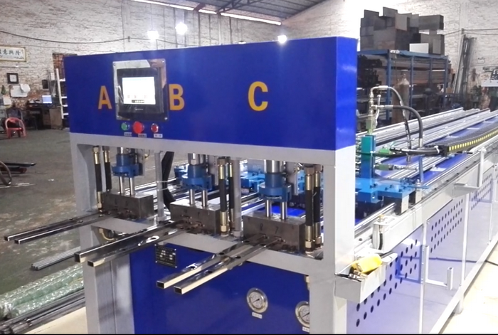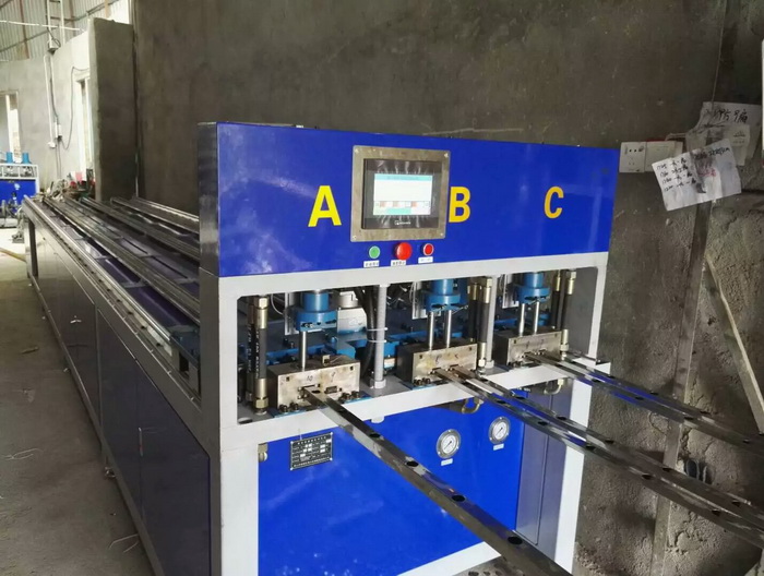 三工位數(shù)控全自動沖孔機(jī),三工位同時(shí)工作,一次沖6支管,每個(gè)油缸可單獨(dú)控制沖全孔、半孔,大大提高不銹鋼防盜網(wǎng)沖孔效率,行業(yè)首創(chuàng),專利產(chǎn)品