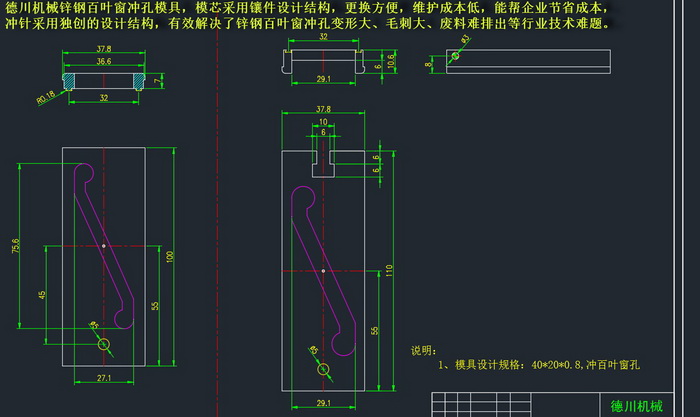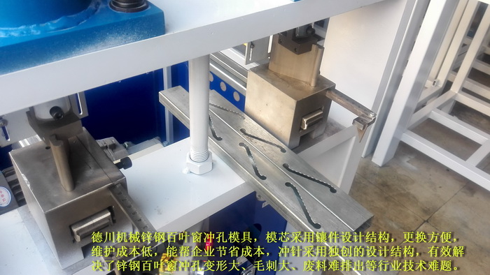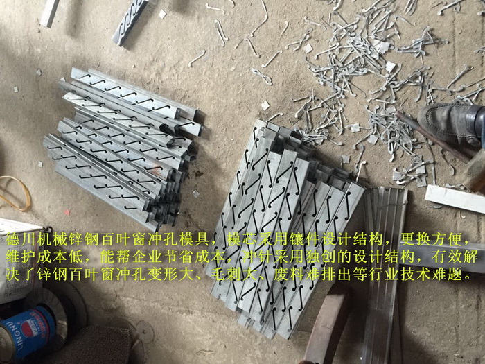 德川機(jī)械鋅鋼百葉窗沖孔模具,模芯采用鑲件設(shè)計結(jié)構(gòu),更換方便,維護(hù)成本低,能幫企業(yè)節(jié)省成本,沖針采用獨創(chuàng)的設(shè)計結(jié)構(gòu),有效解決了鋅鋼百葉窗沖孔變形大、毛刺大、廢料難排出等行業(yè)技術(shù)難題。